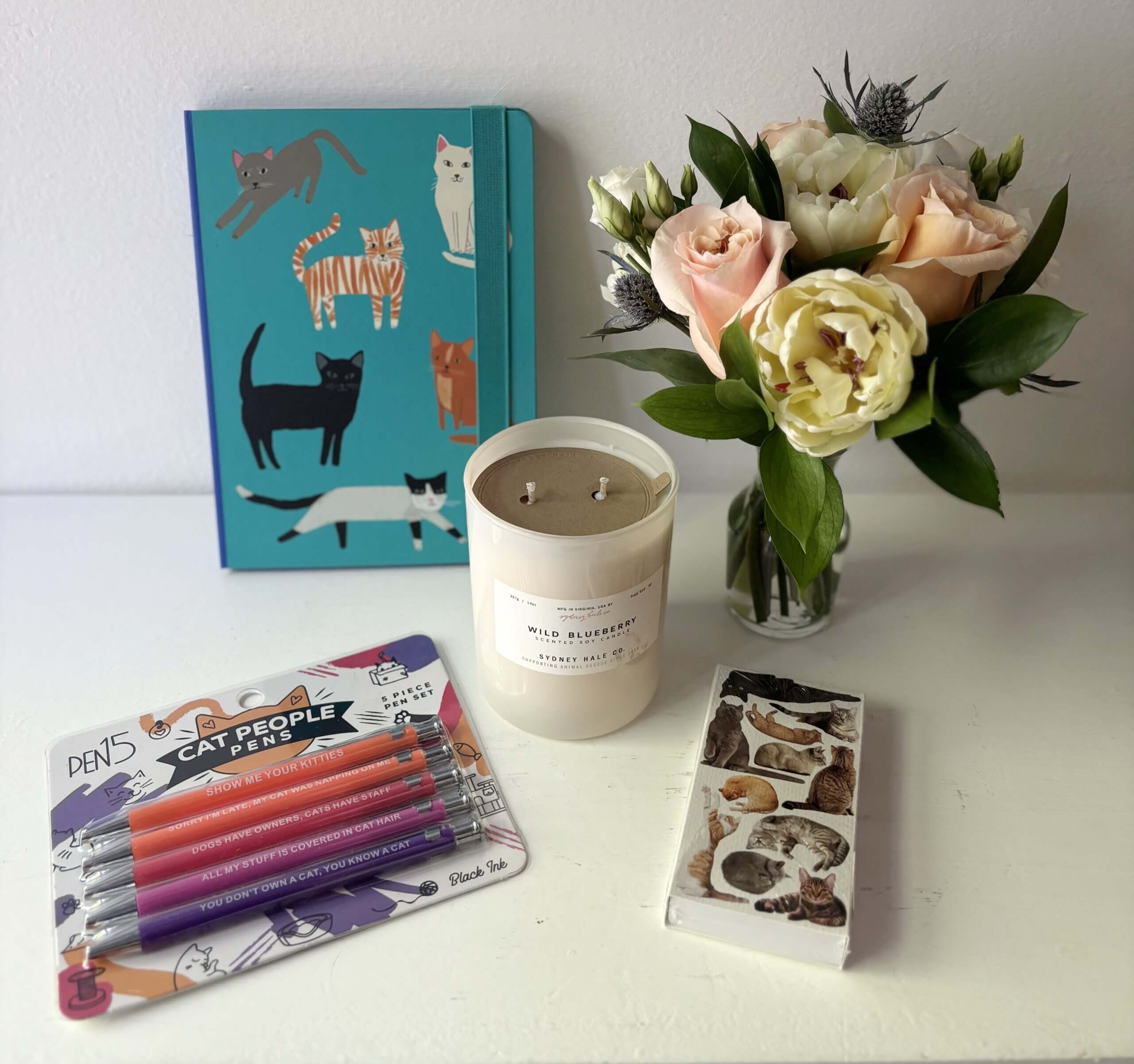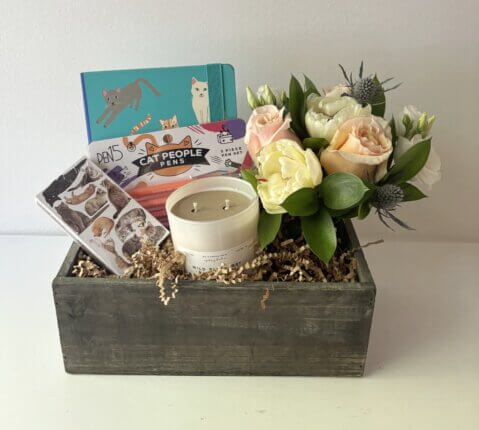 Gift set includes Sydney Hale Candle benefiting animal rescue, matches, cat notebook, cat people pens and a mini floral arrangement.