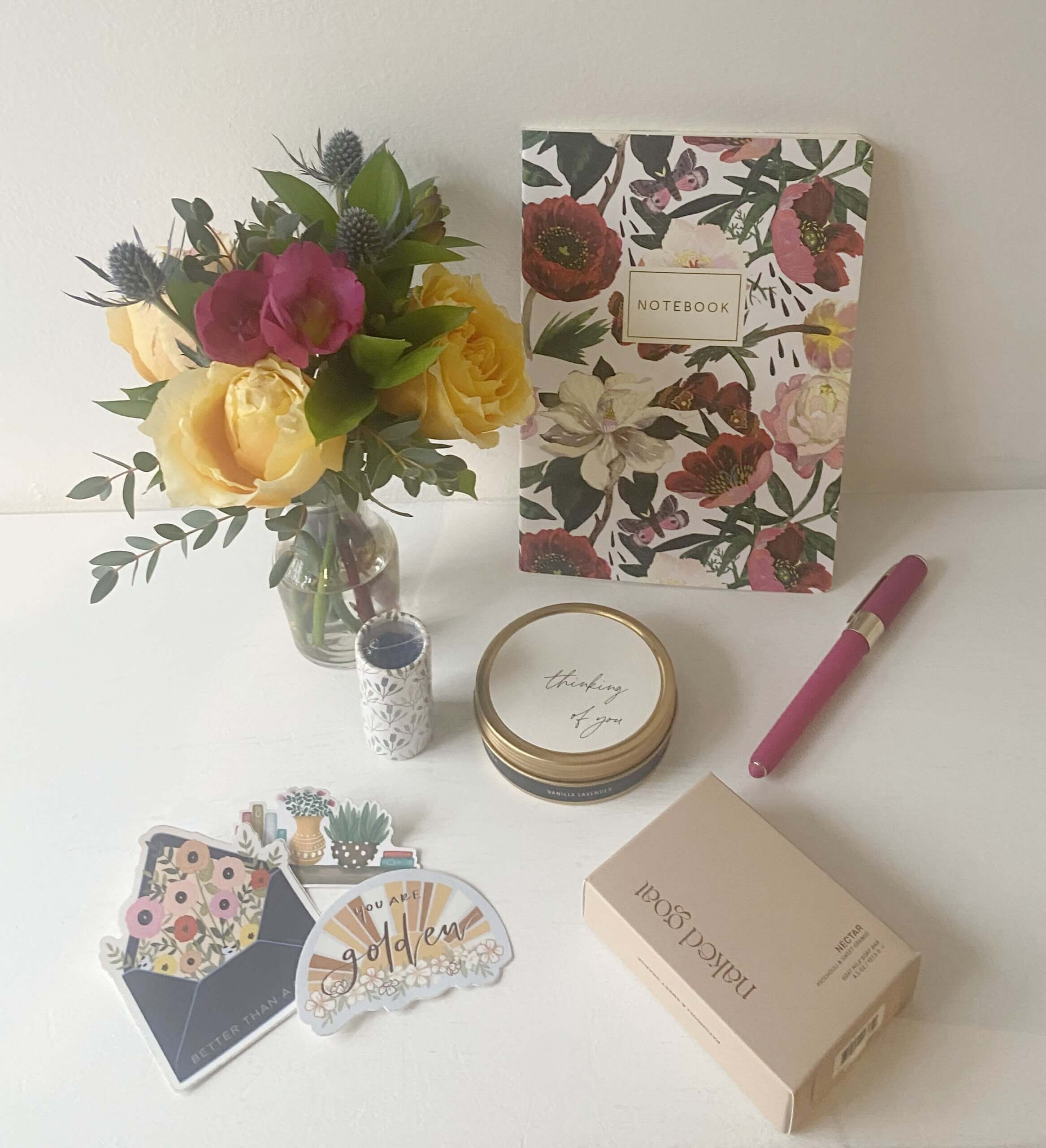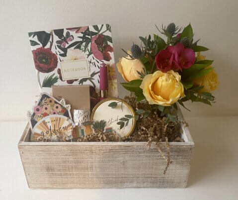 Gift set includes a 4 oz travel tin candle, matches, journal, pen, soap, stickers, and a mini floral arrangement all displayed in a reusable wooden box.