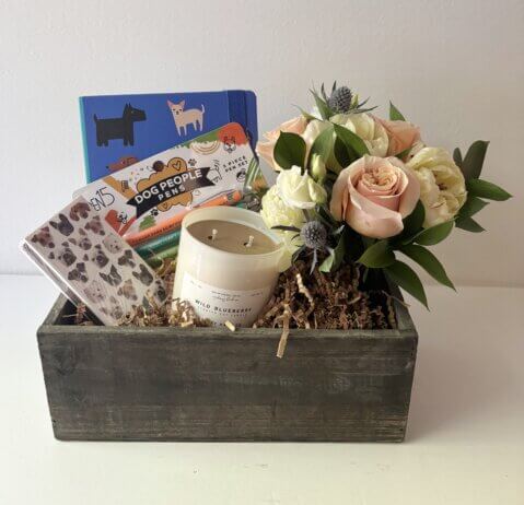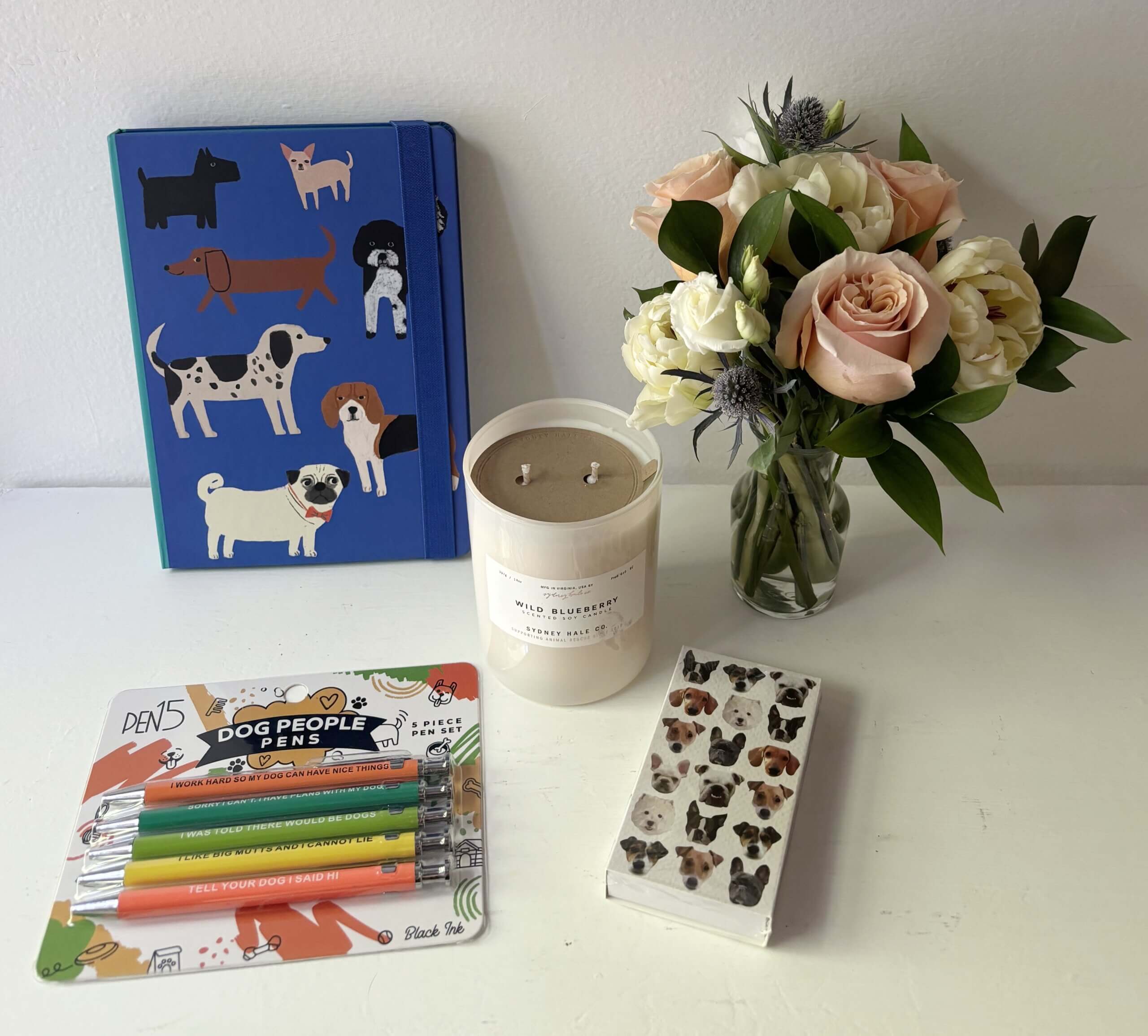 Gift set includes a Sydney Hale Candle benefiting animal rescue, matches, dog notebook, dog people pens and a mini floral arrangement.
