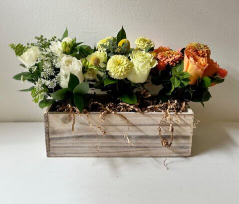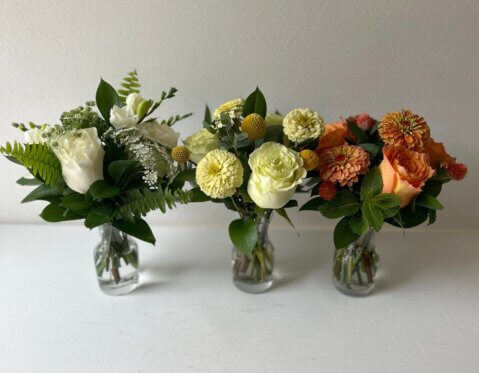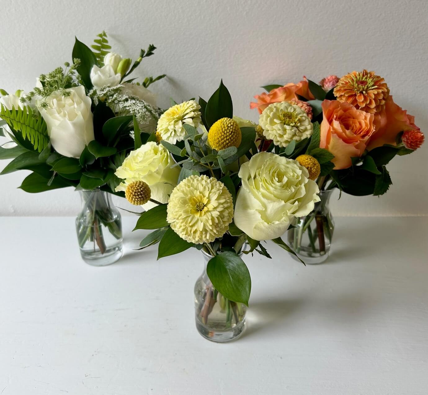 Our newest addition to our flower line up is here! This adorable Flower Flight consists of 3 separate budvases arranged in a beautiful white birch box. Each of the bud vases will vary in color with a variety of blooms that look great together and apart. Use them to brighten every room or as a 3 part table piece. Colors may vary and requests can be made by phone or in the notes box online. Tell someone you’re thinking of them or brighten up your own day with a custom Flower Flight today!