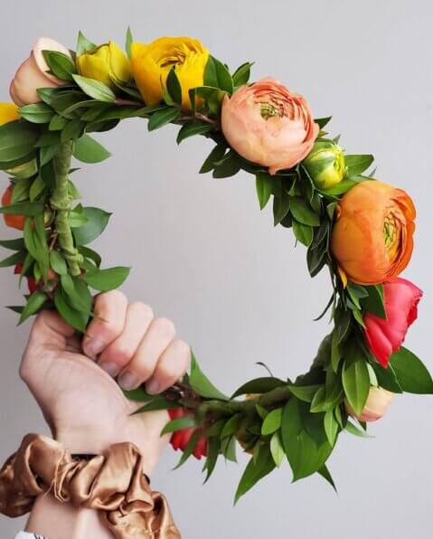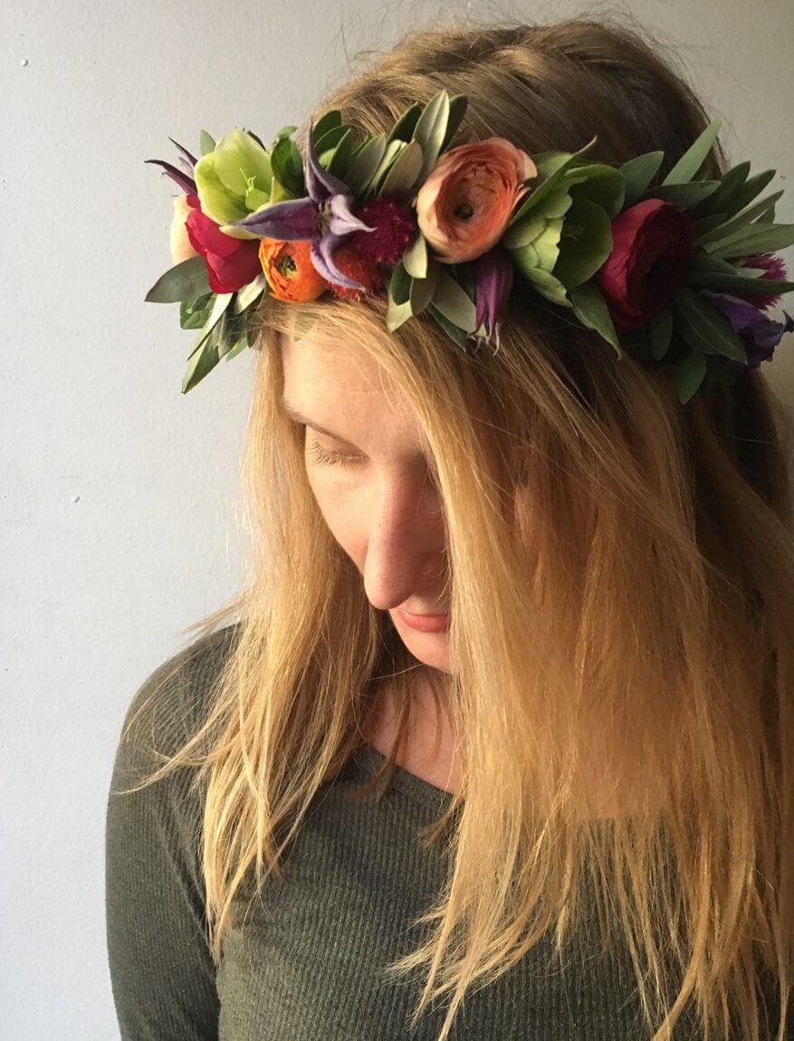 Flower crowns are a fun alternative to wrist corsages and nosegays. Each crown is created to order and requires a 24-48 hour notice to create. Floral crowns are adjustable and can be worn in a variety of ways. Please include your color preferences under order notes. If no color is specified we will select the prettiest seasonal color palette. **Our designers will select the best flowers and greens based on seasonal availability. Because each crown is made fresh to order, your custom floral crown will be one of a kind and may not look like the examples pictured.**