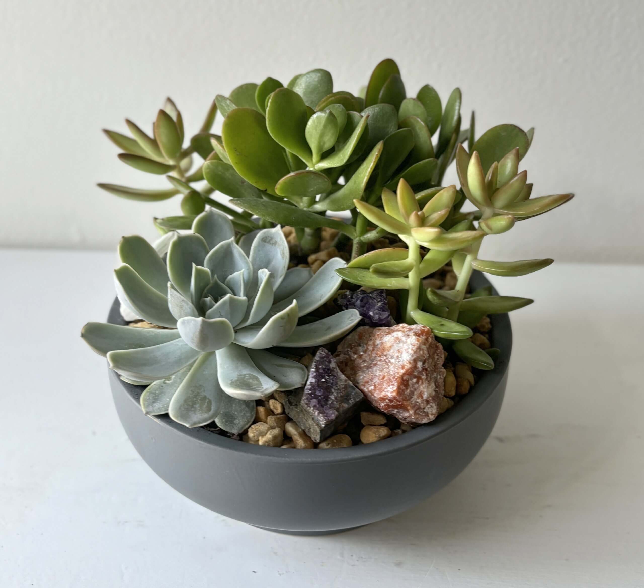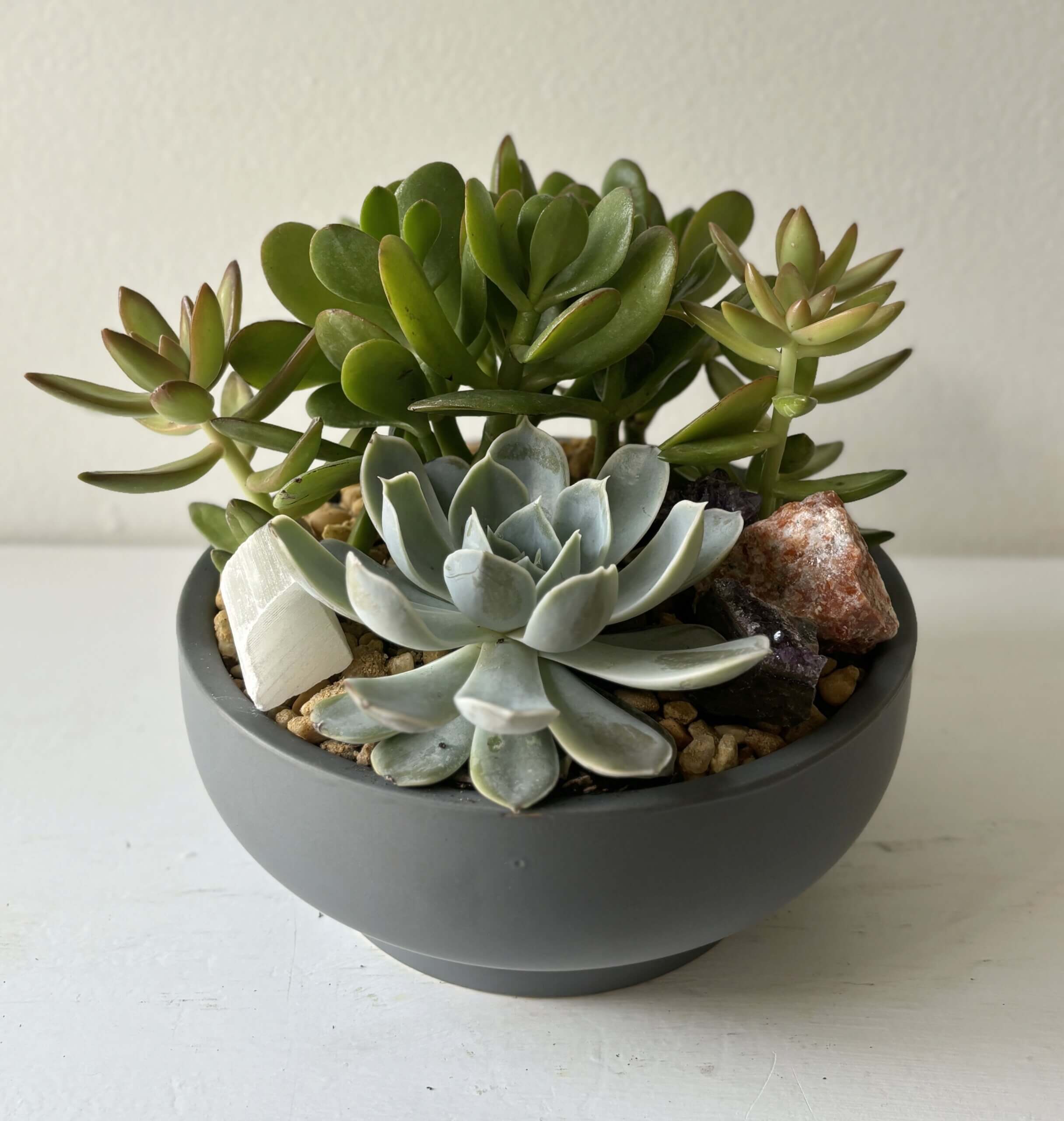 A low maintenance succulent and crystal garden in a modern planter.